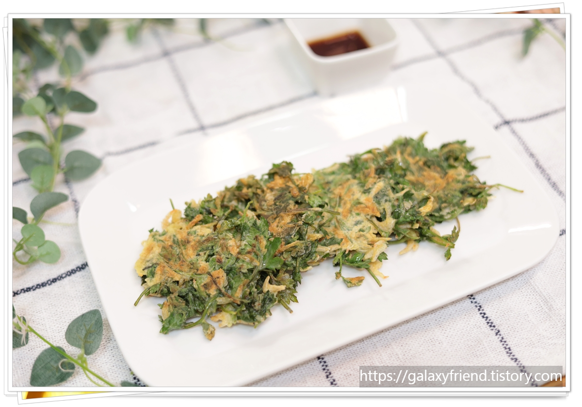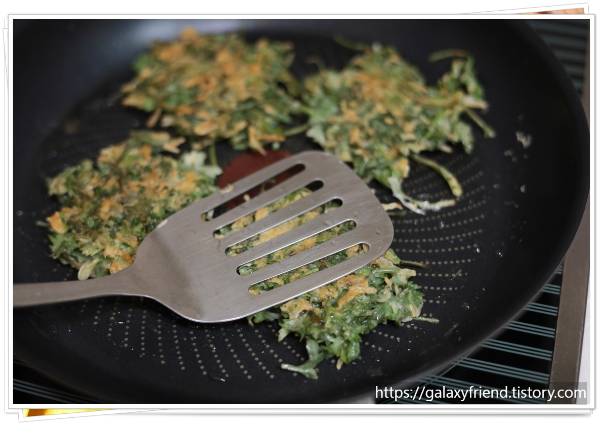 요리를 완성하고 나니 집안 가득 쑥의 진한 향기와 건새우의 고소함이 가득 찼어요. 마침 봄비가 촉촉하게 내리는 날이라 분위기도 정말 좋았답니다. 부치는 소리만 들어도 힐링 되는 기분 아시죠?